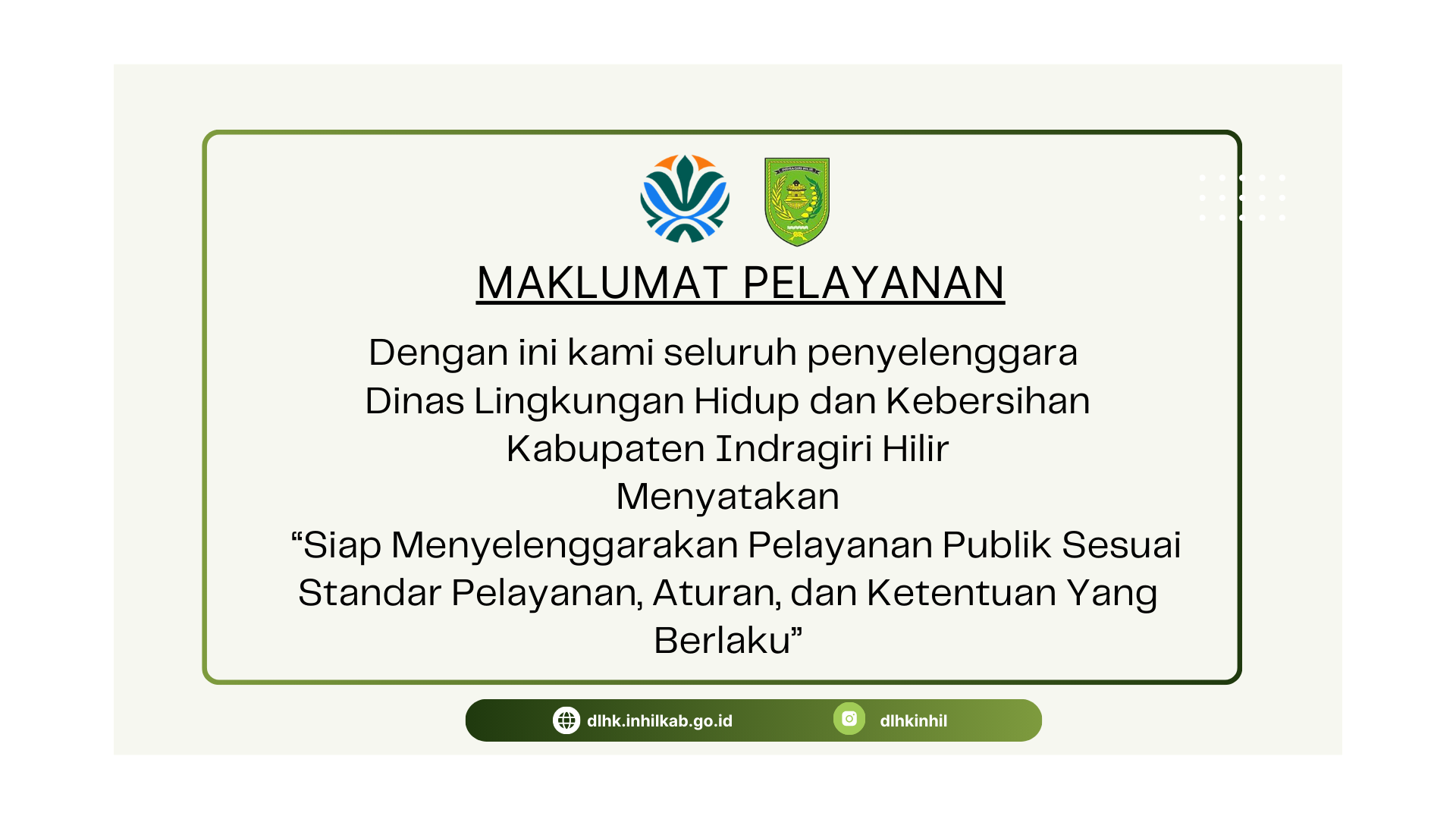 Berdasarkan informasi yang tersedia, Dinas Lingkungan Hidup dan Kebersihan (DLHK) Kabupaten Indragiri Hilir belum mempublikasikan secara spesifik Maklumat Pelayanan. Namun, DLHK Kabupaten Indragiri Hilir telah menetapkan Standar Pelayanan yang mengatur berbagai aspek layanan kepada masyarakat. Dokumen Standar Pelayanan ini mencakup persyaratan, mekanisme, prosedur, sarana prasarana, kompetensi pelaksana, dan jaminan pelayanan untuk berbagai layanan yang disediakan oleh DLHK Kabupaten Indragiri Hilir.