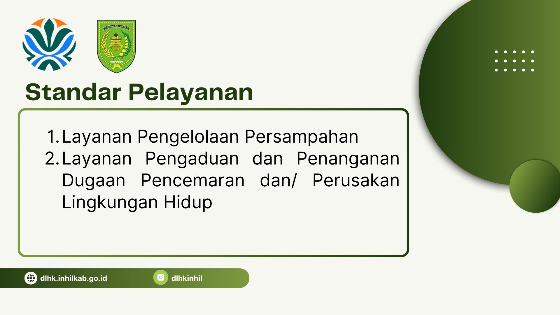 Dinas Lingkungan Hidup dan Kebersihan (DLHK) Kabupaten Indragiri Hilir Memiliki beberapa standar pelayananan diantaranya Layanan pengelolaan persampahan yang merupakan upaya pemerintah daerah melalui DLHK untuk memberikan pelayanan kebersihan dengan cara pengangkutan dan pengurangan timbulan sampah rumah tangga maupun sejenis sampah rumah tangga. Tujuan layanan ini adalah menciptakan lingkungan yang bersih, sehat, dan lestari dengan melibatkan peran serta masyarakat serta penyediaan sarana prasarana persampahan yang memadai.